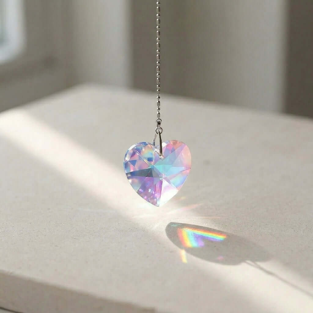 At 28mm, this genuine Swarovski Strass crystal Aurora Borealis heart prism pendant is a captivating window suncatcher and chandelier crystal accent, its romantic heart silhouette and precision-cut facets amplifying the iconic AB iridescent shimmer into a breathtaking full-spectrum rainbow light display from every angle.