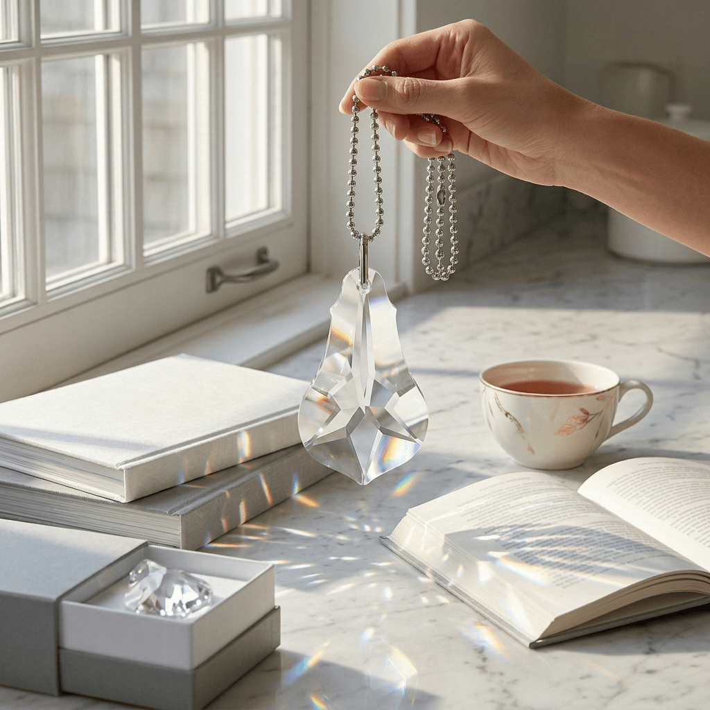 A breathtaking chandelier centerpiece, a stunning window suncatcher, or a truly memorable gift — pre-attached to a 10-inch chrome chain with hook and packed gift-ready.